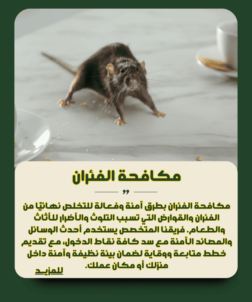 في مجال القوارض، نتميز بإزالة الفئران والجرذان باستخدام أحدث التقنيات والوسائل الآمنة، مع تركيب مصائد متطورة وسد جميع نقاط الدخول لضمان عدم عودتها مرة أخرى. كما نوفر خدمات التطهير والتعقيم بعد الرش، مع خطط متابعة وقائية مستمرة، إضافة إلى خدمة الطوارئ المتاحة على مدار 24 ساعة للحفاظ على بيئة آمنة ونظيفة داخل المنازل والشركات.